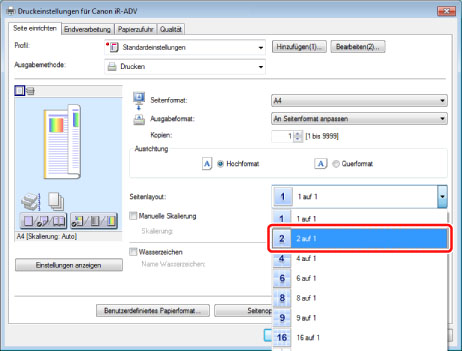 Wählen Sie auf der Registerkarte [Seite einrichten] unter [Seitenlayout] die Option [2 auf 1] aus.