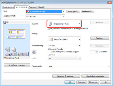 Bestätigen Sie, das [Doppelseitiger Druck] für [Druckstil] gewählt ist → Klicken Sie auf [OK].