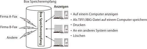 Die empfangenen Daten werden in der Box Speicherempfang Ihres imageRUNNER ADVANCE gespeichert. Diese Box dient im System als erster Zwischenspeicher für Dokumente, die per Fax, Internet- oder Intranet-Fax eingehen. Die empfangenen Dokumente können wie folgt verarbeitet werden: