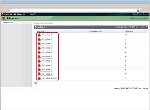 Greifen Sie auf das Remote UI zu → Klicken Sie auf [Adressbuch] → Wählen Sie auf der Seite mit den Adresslisten das gewünschte Adressbuch aus.