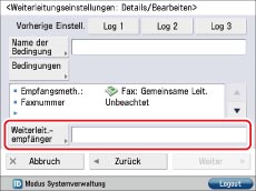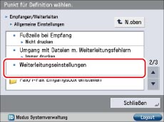 → Berühren Sie nacheinander die Tasten [Einstellungen Funktion] → [Empfangen/Weiterleiten] → [Allgemeine Einstellungen] → [Einstellungen Weiterleitung].