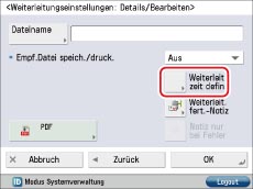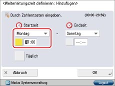 Berühren Sie die Taste [Weiterleit. zeit defin.] → Definieren Sie die Zeit und das Datum, an dem die Weiterleitungsbedingungen gelten sollen.