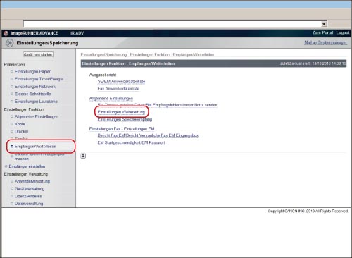 Greifen Sie auf Remote UI zu → Klicken Sie auf [Einstellungen/Speicherung] → [Empfangen/Weiterleiten] → [Einstellungen Weiterleitung].