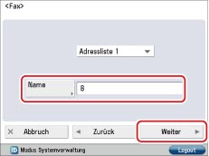 Berühren Sie nacheinander die Tasten [Neue Empf. speichern] → [Fax] → Geben Sie "Geschäftsstelle B" als Namen ein → Berühren Sie die Taste [Weiter].