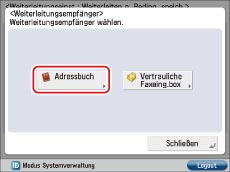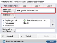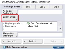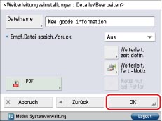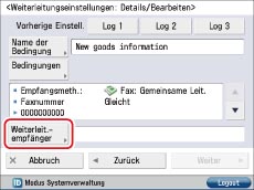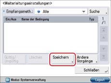 → Berühren Sie nacheinander die Tasten [Einstellungen Funktion] → [Empfangen/Weiterleiten] → [Allgemeine Einstellungen] → [Einstellungen Weiterleitung] → [Speichern].