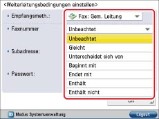 Die für den Sender gespeicherte Faxnummer kann Unregelmäßigkeiten wie "Nullvorwahl", Leerstellen oder die Ländervorwahl aufweisen. Weiterleitungsbedingungen können sich durch solche Unregelmäßigkeiten ändern. Wenn Sie sich nicht sicher sind, ob eine Unregelmäßigkeit vorhanden ist, wählen Sie die Option [Enthält] anstelle von [Gleicht].