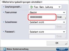Wählen Sie unter <Empfangsmeth.> die Option [Fax: Gem. Leitung] und unter <Faxnummer> die Option [Gleicht].