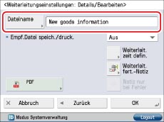 Sie können einen beliebigen Dateinamen vorgeben. Der angegebene Name wird für die weitergeleiteten und im Freigabeordner abgelegten Dateien verwendet.