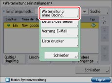 → Berühren Sie nacheinander die Tasten [Einstellungen Funktion] → [Empfangen/Weiterleiten] → [Allgemeine Einstellungen] → [Einstellungen Weiterleitung] → [Andere Vorgänge] → [Weiterleitung ohne Beding.].