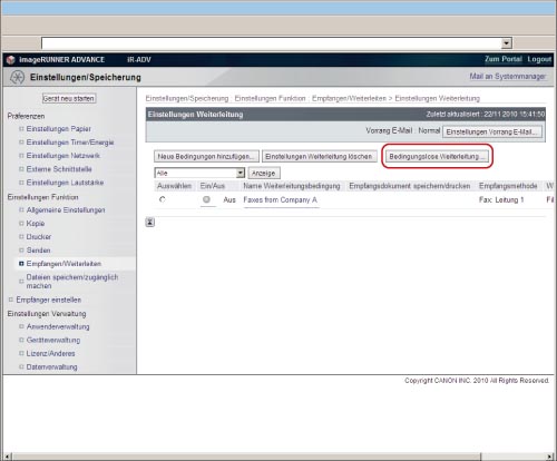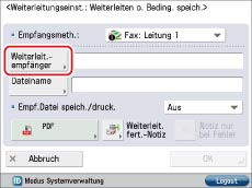 Beachten Sie bitte, dass bei Einstellung der Weiterleitungsbedingung auf 'Aus' empfangene Faxe ausgegeben und nicht automatisch an einen Computer weitergeleitet werden.