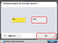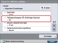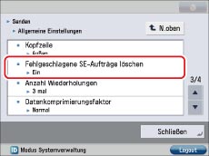 → Berühren Sie nacheinander die Tasten [Einstellungen Funktion] → [Senden] → [Allgemeine Einstellungen] → [Fehlgeschlagene SE-Aufträge löschen].