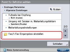 → Berühren Sie nacheinander die Tasten [Einstellungen Funktion] → [Empfangen/Weiterleiten] → [Allgemeine Einstellungen] → [Fax/I-Fax Eingangsbox einstellen].