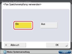 Berühren Sie die Taste [Fax Speicherempfang verwenden] → [Ein].