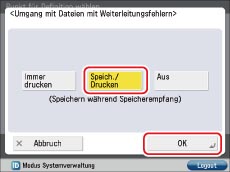 → Berühren Sie nacheinander die Tasten [Einstellungen Funktion] → [Empfangen/Weiterleiten] → [Allgemeine Einstellungen] → [Vorgang bei Dateien mit Weiterleitungsfehlern] → Wählen Sie [Speich./Drucken] → Berühren Sie [OK].