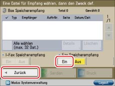 Berühren Sie [Ein] bei <Fax Speicherempfang> → [Zurück].