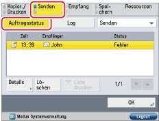 Der Status aller zu sendenden Aufträge (Fax, Internet-Fax, Dateiübertragung, E-Mail und Weiterleitung) wird angezeigt, und <Fehler> wird bei Weiterleitungsfehlern genau so angezeigt wie bei anderen Übertragungsfehlern.