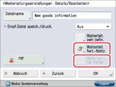 Sie können die Funktion so einrichten, dass nur bei Auftreten eines Weiterleitungsfehlers eine Benachrichtigung per E-Mail gesendet wird. Wählen Sie eine Weiterleitungsbedingung → Berühren Sie [Details/Bearbeiten] → Wählen Sie [Weiterleit. fert.-Notiz] und [Notiz nur bei Fehler].
