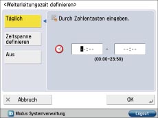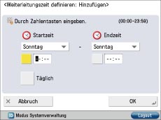 Mit der Funktion [Weiterleit. zeit defin.] können Sie das System so einrichten, dass Weiterleitungseinstellungen an bestimmten Tagen und zu bestimmten Zeiten gültig/ungültig sind. So können Sie beispielsweise eine Weiterleitung zu Zeiten unterbinden, in denen der Computer ausgeschaltet ist, wie nach Feierabend und an Feiertagen.