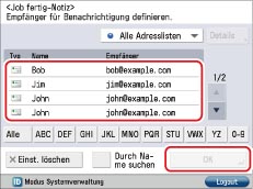 Berühren Sie im Hauptmenü nacheinander die Tasten [Fax] → [Optionen] → [Job fertig-Notiz] → Wählen Sie den Empfänger der Job fertig-Notiz → Berühren Sie die Taste [OK] → [Schließen].