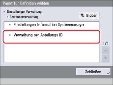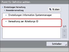 → Berühren Sie nacheinander die Tasten [Einstellungen Verwaltung] → [Anwenderverwaltung] → [Verwaltung per Abteilungs ID].