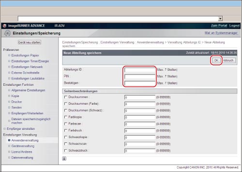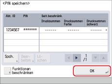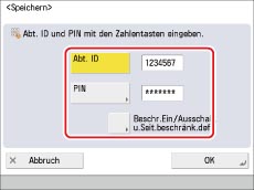 Geben Sie die Abteilungs ID und PIN ein → Geben Sie dieselbe Abteilungs ID und PIN zur Bestätigung ein → Klicken Sie auf [OK].