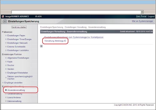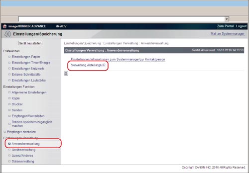 Greifen Sie auf Remote UI zu → Klicken Sie auf [Einstellungen/Speicherung] → [Anwenderverwaltung] → [Verwaltung per Abteilungs ID].