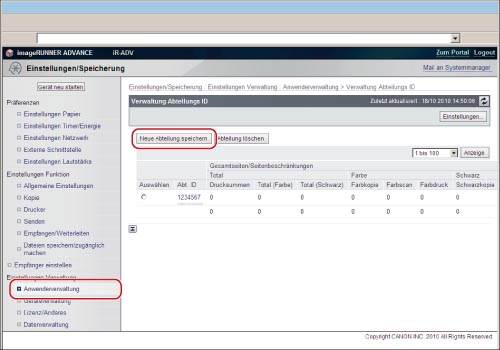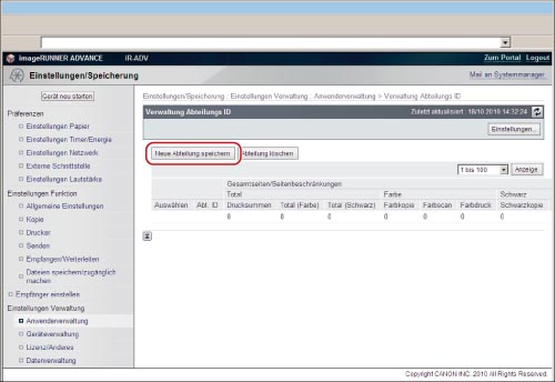 Greifen Sie auf Remote UI zu → Klicken Sie auf [Einstellungen/Speicherung] → [Anwenderverwaltung] → [Verwaltung per Abteilungs ID] → [Neue Abteilung speichern].