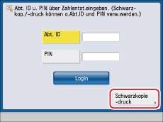 Wenn [Schwarzkopier-/druckaufträge zulassen] aktiviert ist, wird [Schwarzkopie -druck] unter dem Eingabefeld für die Abteilungs ID angezeigt. Wenn Sie [Schwarzkopie -druck] berühren, können Sie Schwarzweißdokumente ohne Eingabe der Abteilungs ID ausdrucken.