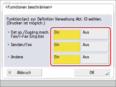 Mit dieser Funktion können Sie Anwendern Beschränkungen für bestimmte Funktionen auferlegen, mit Ausnahme der Kopier- und der Druckfunktion, die der Verwaltung per Abteilungs ID unterliegen.