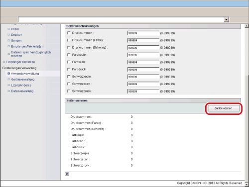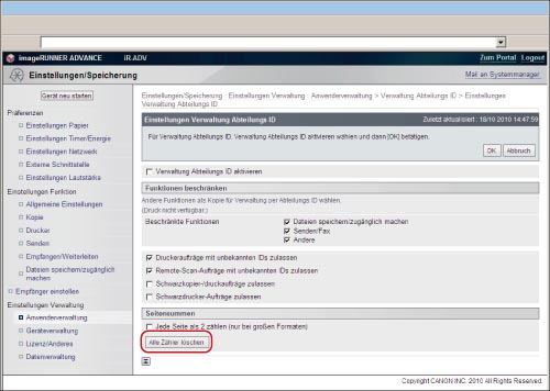 Zum Zurücksetzen der Zählerstände aller Abteilung klicken Sie auf dem Bildschirm für die Verwaltung per Abteilungs ID auf [Einstellungen] → Klicken Sie auf [Alle Zähler löschen].