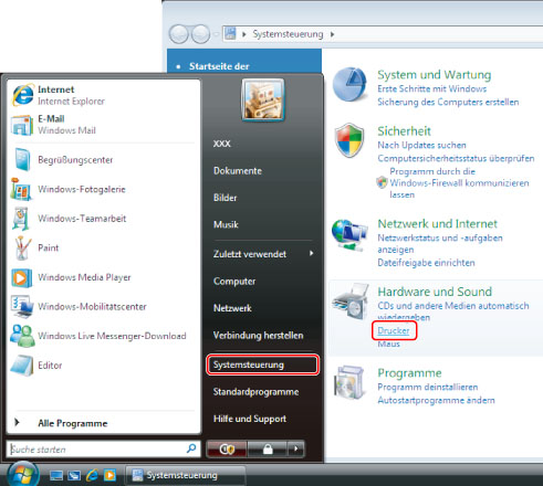 Wählen Sie für Windows XP [Start] → [Drucker und Faxgeräte] (oder [Start] → [Systemsteuerung] → [Drucker und andere Hardware] → [Drucker und Faxgeräte]). Klicken Sie für Windows Vista auf [] (Start) → Wählen Sie [Systemsteuerung] → [Drucker]. Klicken Sie für Windows 7 auf [] (Start) → [Geräte und Drucker].