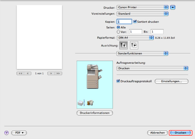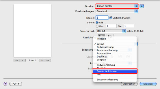 Wählen Sie den zu verwendenden Drucker → Wählen Sie das Panel [Sonderfunktionen].