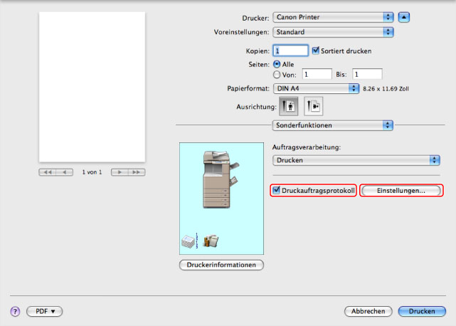 Wählen Sie im Panel [Sonderfunktionen] die Option [Druckauftragsprotokoll] → Klicken Sie auf [Einstellungen].