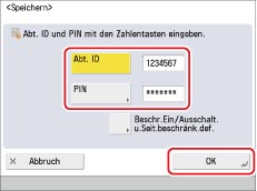 Wählen Sie [PIN-Festlegung zulassen] → Geben Sie die Abteilungs-ID und PIN ein, die Sie in Schritt 4 unter "Einrichten des Systems" gespeichert haben.