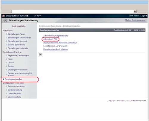 Greifen Sie auf Remote UI zu → Klicken Sie auf [Einstellungen/Speicherung] → [Empfänger einstellen] → [Adressbuch PIN].
