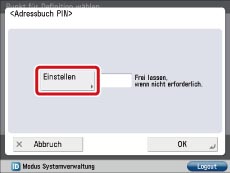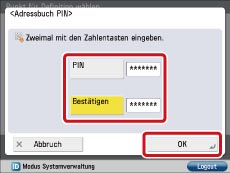 Wählen Sie [Adressbuch PIN einstellen] → Geben Sie bis zu sieben Ziffern für <Adressbuch PIN> ein und <Bestätigen> Sie.
