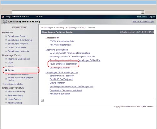 Greifen Sie auf Remote UI zu → Klicken Sie auf [Einstellungen/Speicherung] → [Senden] → [Neuen Empfänger beschränken].