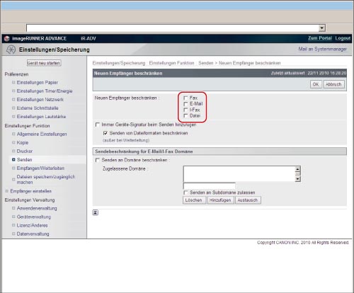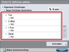 Sie können die Beschränkungen für jede Sendefunktion (Fax, E-Mail, I-Fax, Dateiserver) ein- oder ausschalten.