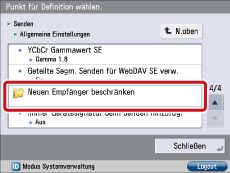 → Berühren Sie nacheinander die Tasten [Einstellungen Funktion] → [Senden] → [Allgemeine Einstellungen] → [Neuen Empfänger beschränken].