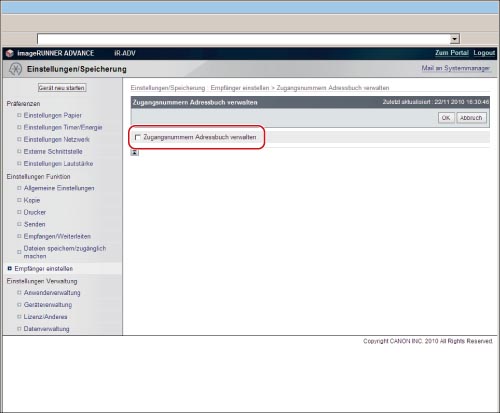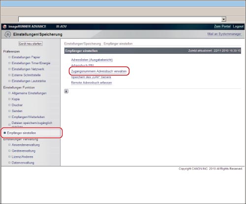 Greifen Sie auf Remote UI zu → Klicken Sie auf [Einstellungen/Speicherung] → [Empfänger einstellen] → [Zugangsnummern für Adressbuch verwalten].