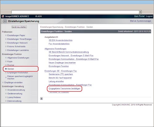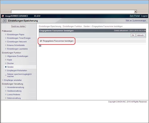Greifen Sie auf Remote UI zu → Klicken Sie auf [Einstellungen/Speicherung] → [Senden] → [Eingegebene Faxnummer bestätigen].