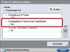 → Berühren Sie nacheinander die Tasten [Einstellungen Funktion] → [Senden] → [Einstellungen Fax] → [Eingegebene Faxnummer bestätigen].