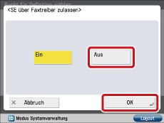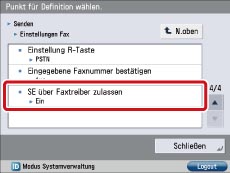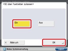 → Berühren Sie nacheinander die Tasten [Einstellungen Funktion] → [Senden] → [Einstellungen Fax] → [SE über Faxtreiber zulassen].