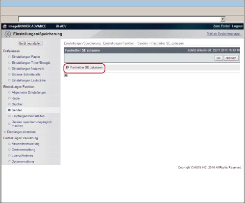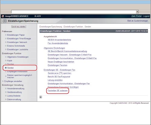 Greifen Sie auf Remote UI zu → Klicken Sie auf [Einstellungen/Speicherung] → [Senden] → [Faxtreiber SE zulassen].
