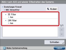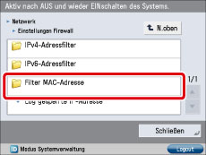 → Berühren Sie nacheinander die Tasten [Präferenzen] → [Netzwerk] → [Einstellungen Firewall] → [Filter MAC-Adresse].