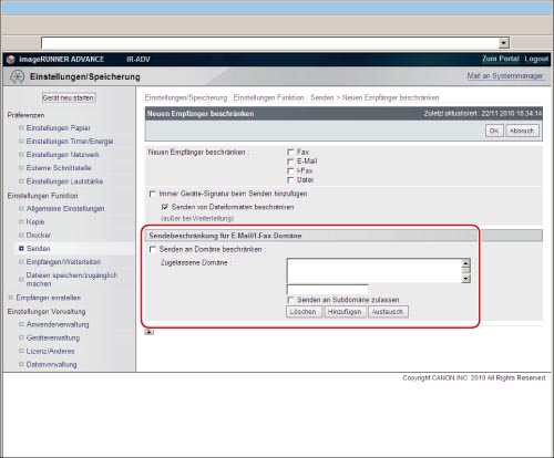 Diese Funktion erlaubt ein Beschränken der Domänen, an die E-Mails gesendet werden können.