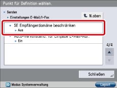 → Berühren Sie nacheinander die Tasten [Einstellungen Funktion] → [Senden] → [Einstellungen E-Mail/I-Fax] → [SE Empfängerdomäne beschränken].