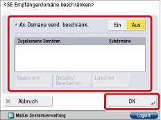 Wählen Sie die Empfängerarten, die beschränkt werden sollen → Berühren Sie nacheinander die Tasten [Ein] → [OK].