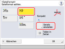 Geben Sie den Empfänger an → Berühren Sie die Taste [Dateiformat] → [PDF] → [Details einstellen].