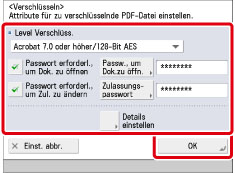 Wenn Sie [Passwort erforderl., um Zul. zu ändern] wählen → Betätigen Sie die Taste [Details einstellen] → Legen Sie die Verschlüsselungsebene und die sonstigen Einstellungen fest.